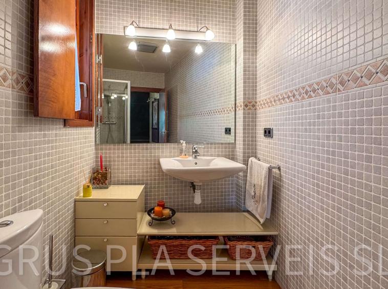 Planta primera amb sala-menjador amb llar de foc tancada, un bany amb dutxa i àmplia cuina tancada. Planta primera amb tres